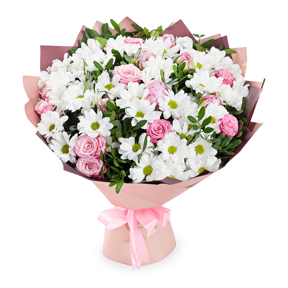 Изысканный букет сочетает нежно-розовые розы и пышную белую хризантему, создавая гармонию романтики и чистоты. Эта свежая композиция идеально подходит для признания в чувствах или особого поздравления. Купить букет цветов в Черноголовке.